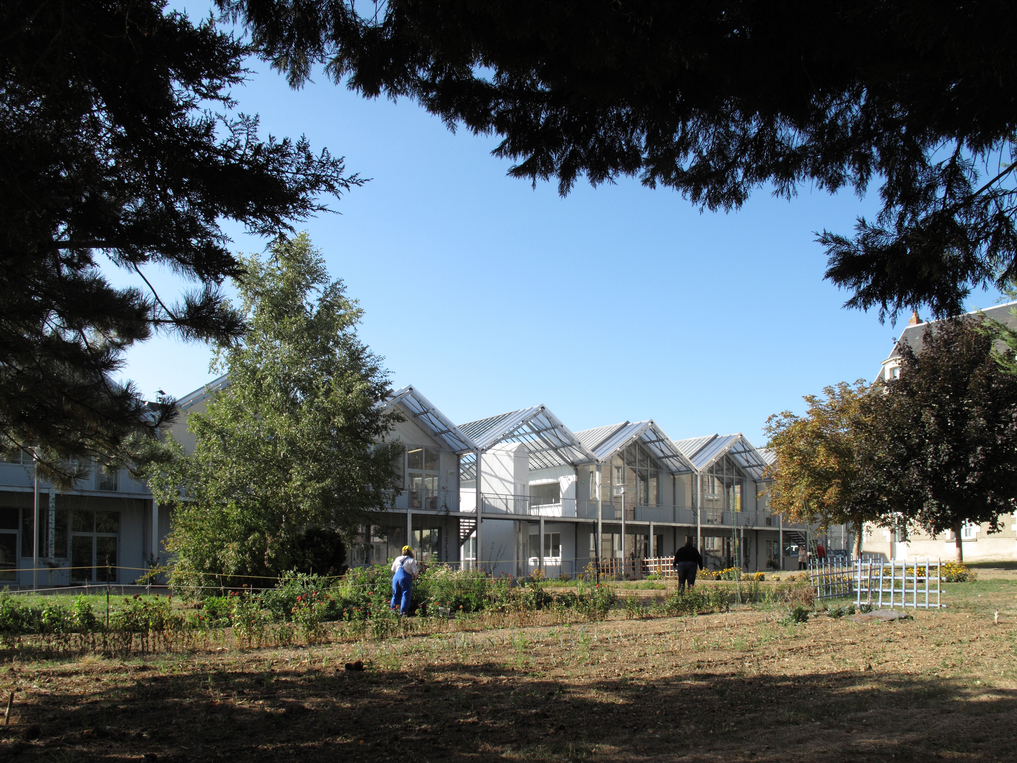 Il s'agit de conserver une partie de l’IME dans un bâtiment réhabilité et de déplacer le reste du programme dans un bâtiment neuf. Le nouveau bâtiment est implanté le long du mur de clôture en pierre existant au Sud-est du site. Ces ateliers sont organisés autour d’une halle extérieure couverte dans laquelle sont orientées les principales circulations verticales (ascenseur) et horizontales (coursives).