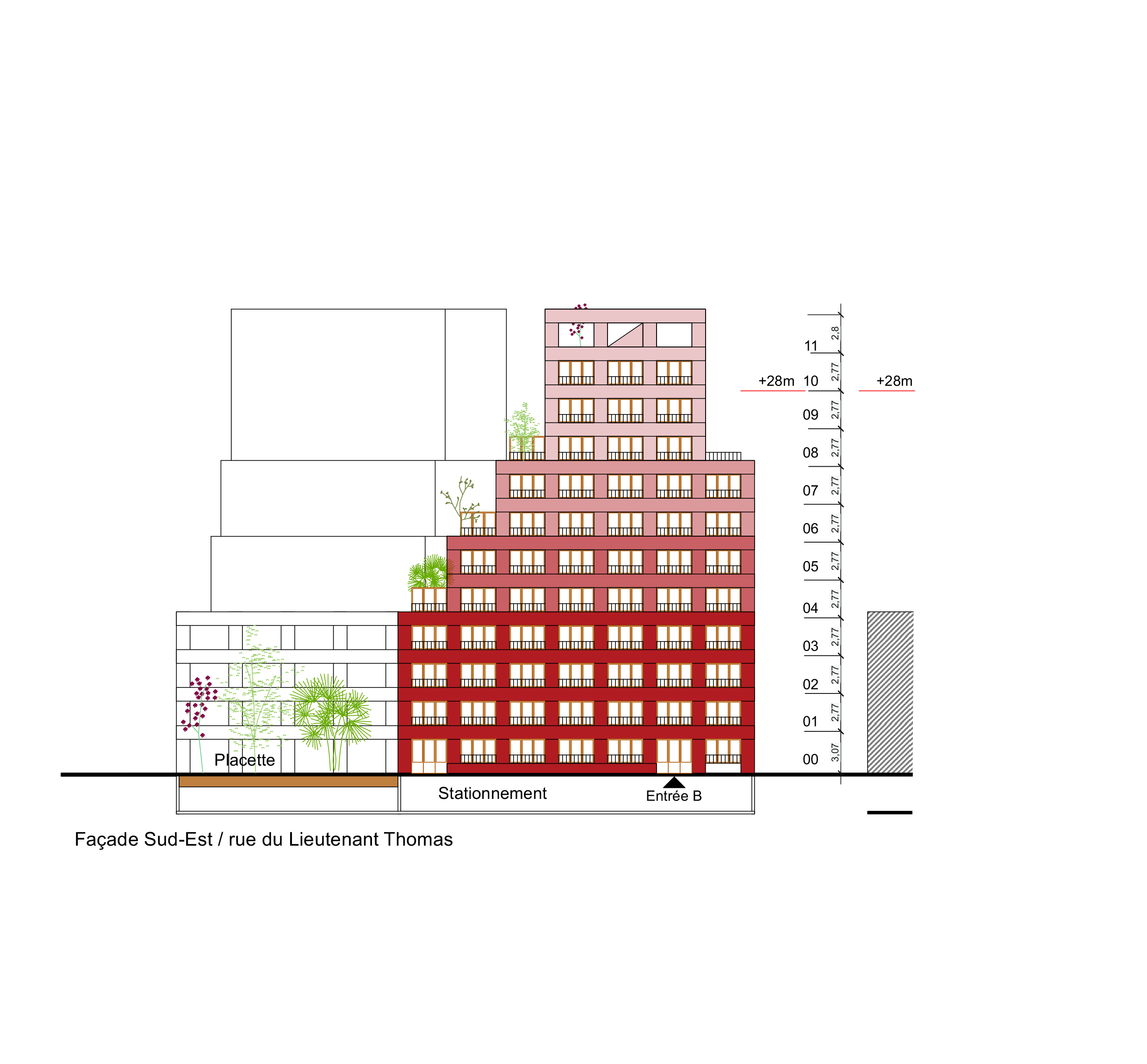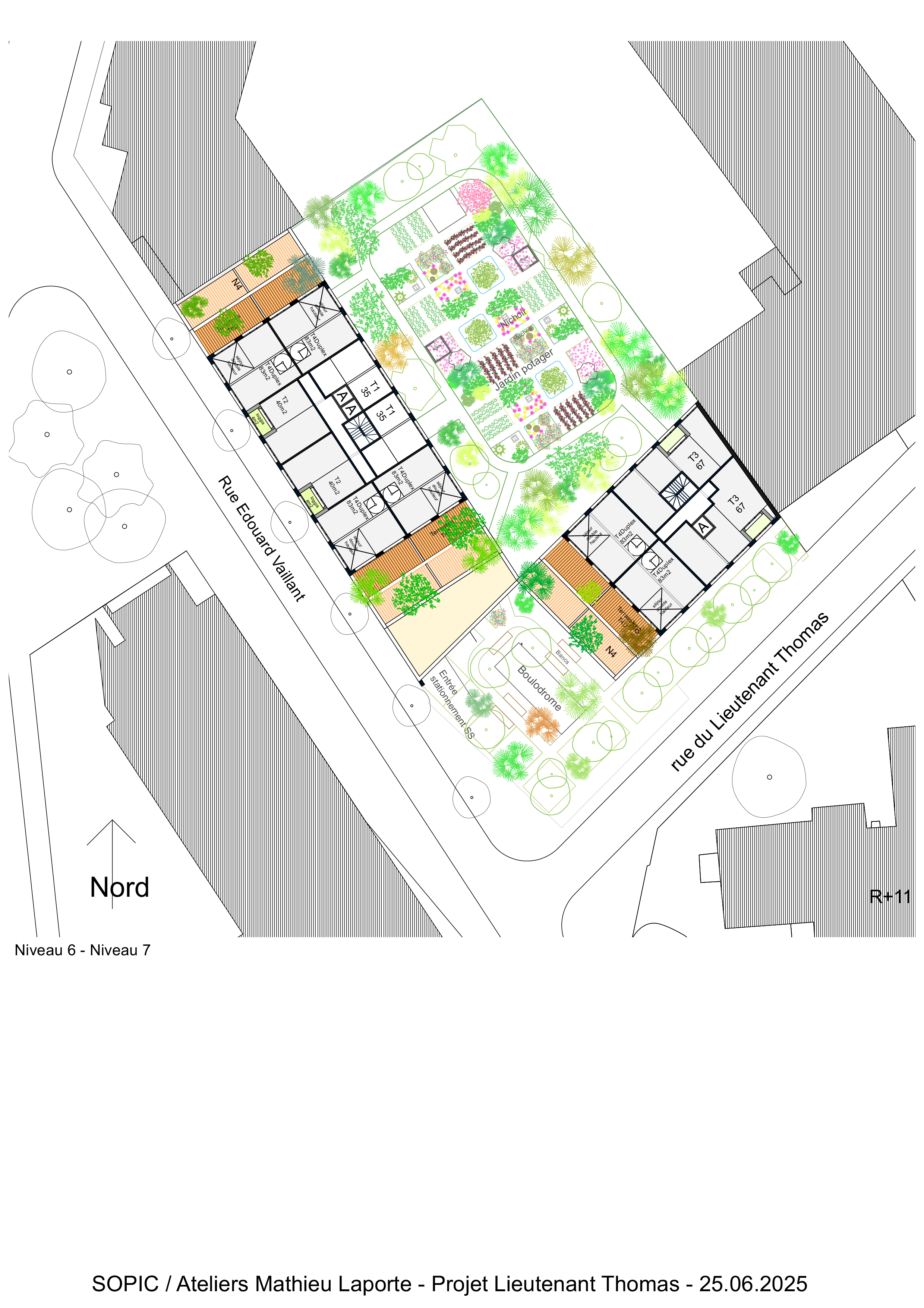 Le projet propose la construction de deux immeubles en R+10 sur deux niveaux de sous-sol. La disposition de ces deux immeubles permet d’une part de créer un placette au sud de l’opération et, côté intérieur d’ilot, de mettre en place une grande cour arborée composée de jardins potagés partagés, de nombreux arbres de haute tiges ainsi qu’une promenade.